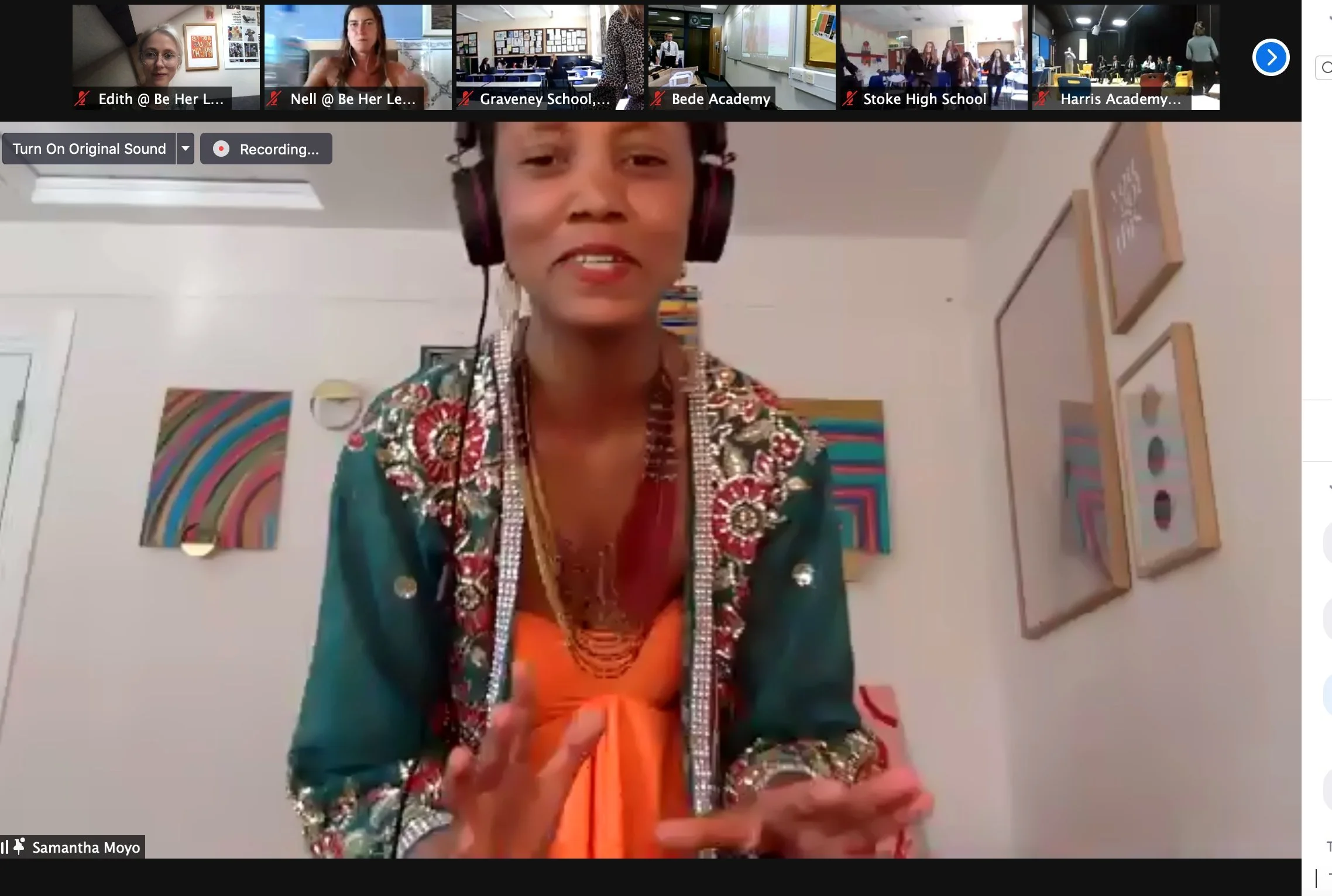Be Her Lead Champion Samantha Moyo meeting Be Her Lead students via Zoom in 2021